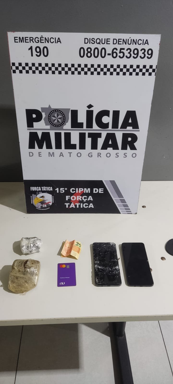 Na ocorrência, foram apreendidos dois tabletes de maconha e dois aparelhos celulares. A ação contou com a participação das equipes FT 90 e FT 20 da Força Tática.